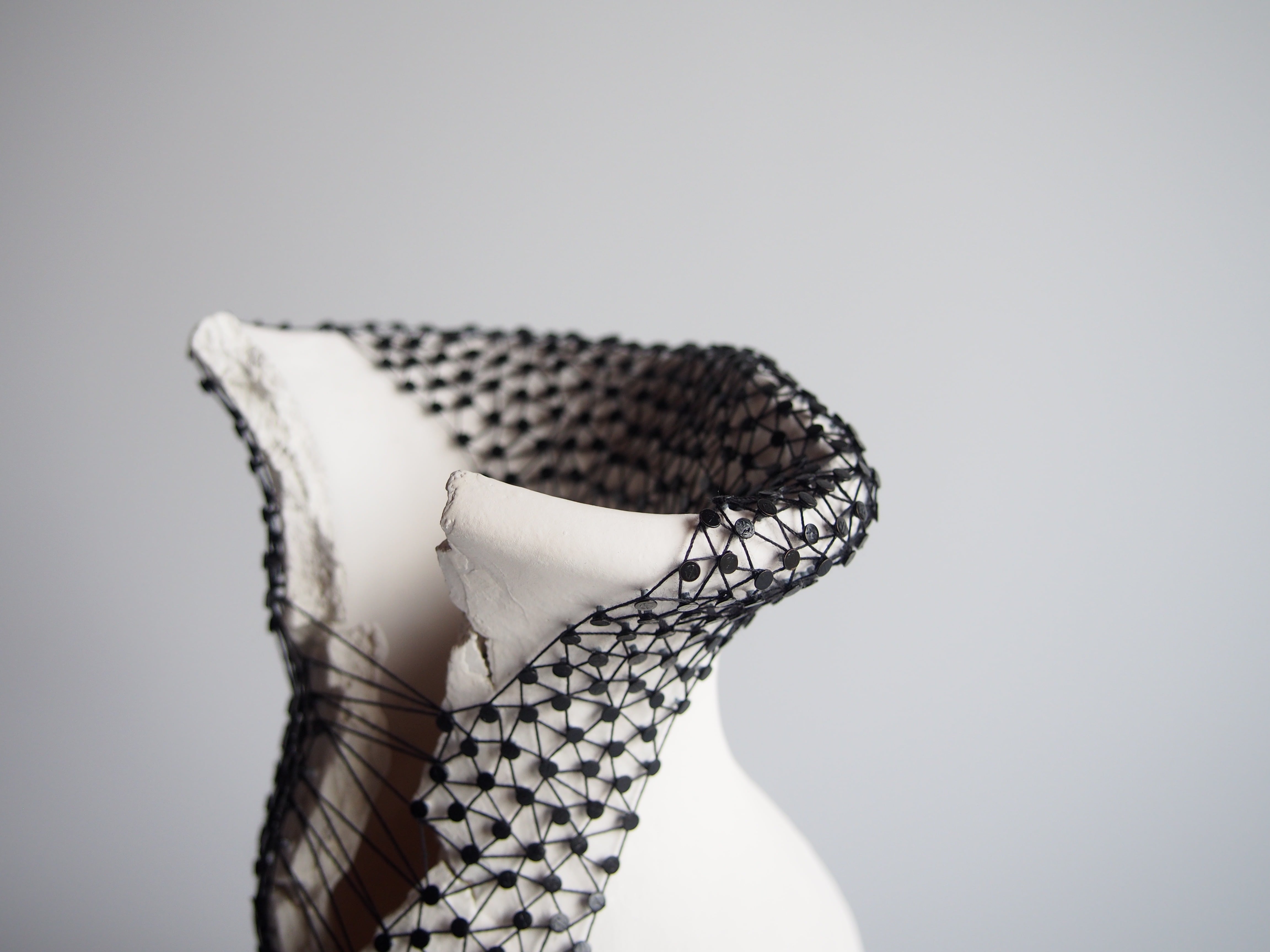 纏う、繕う、繋ぐ、縛る。うつわと糸の関係をどう捉えるかでまた作品の見え方は変わってくると思います。ご鑑賞いただく方がそれぞれの解釈で楽しんで頂けましたら幸いです。