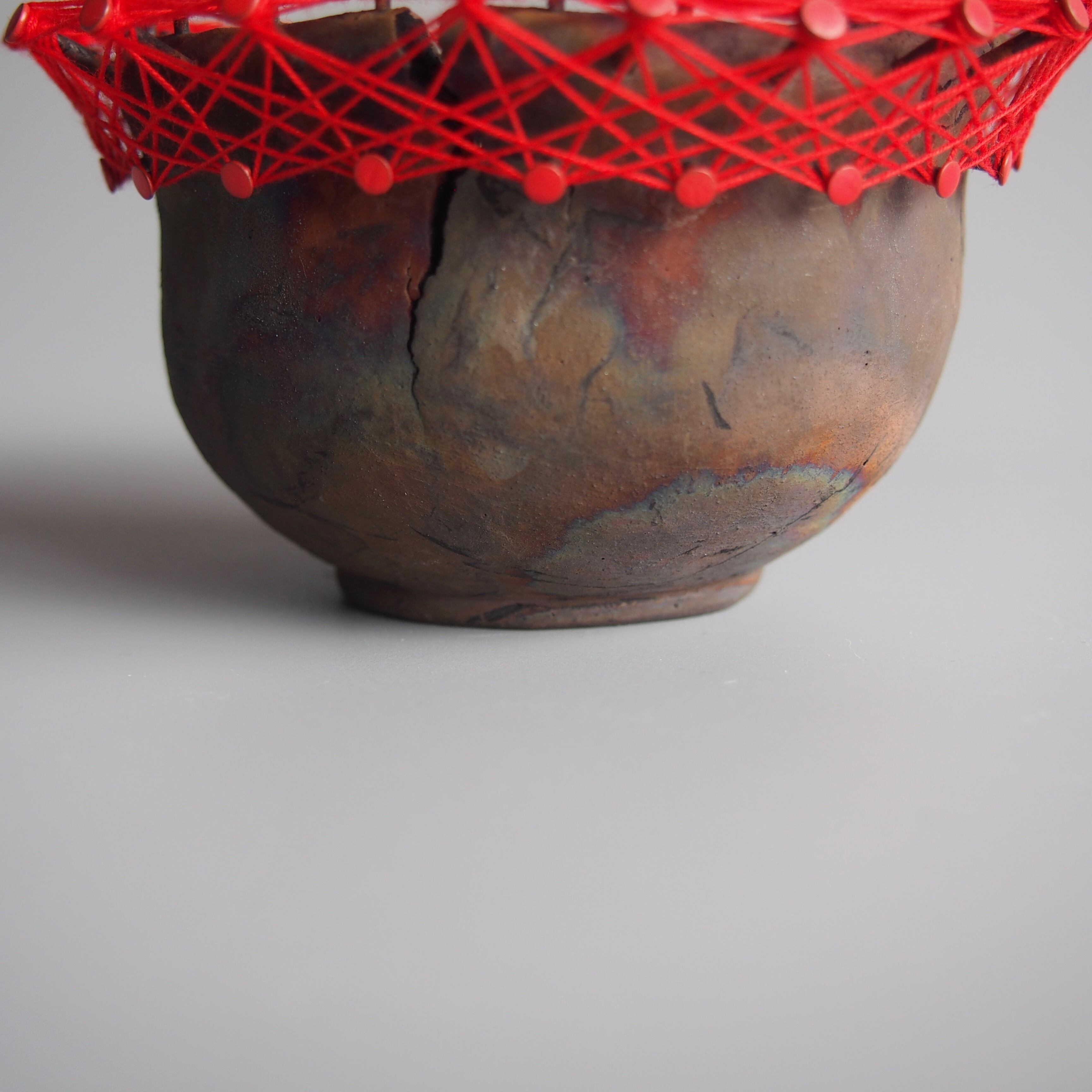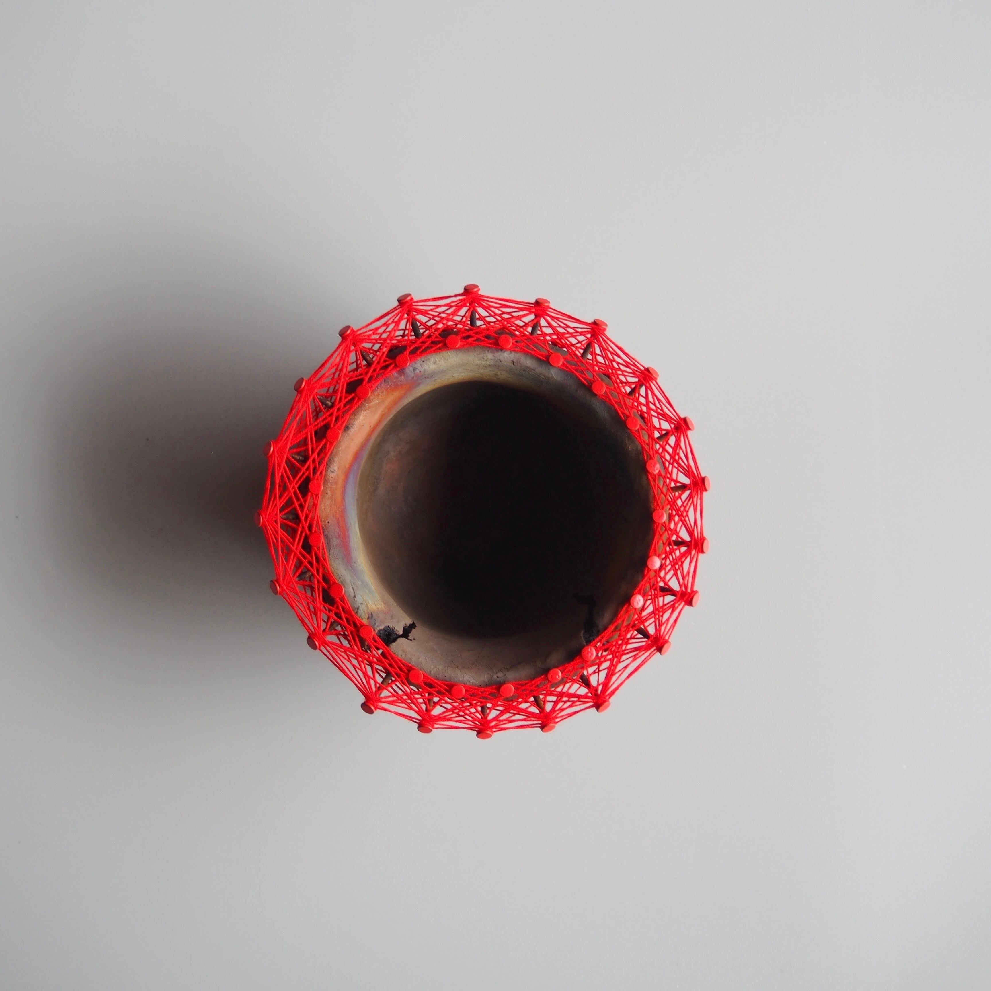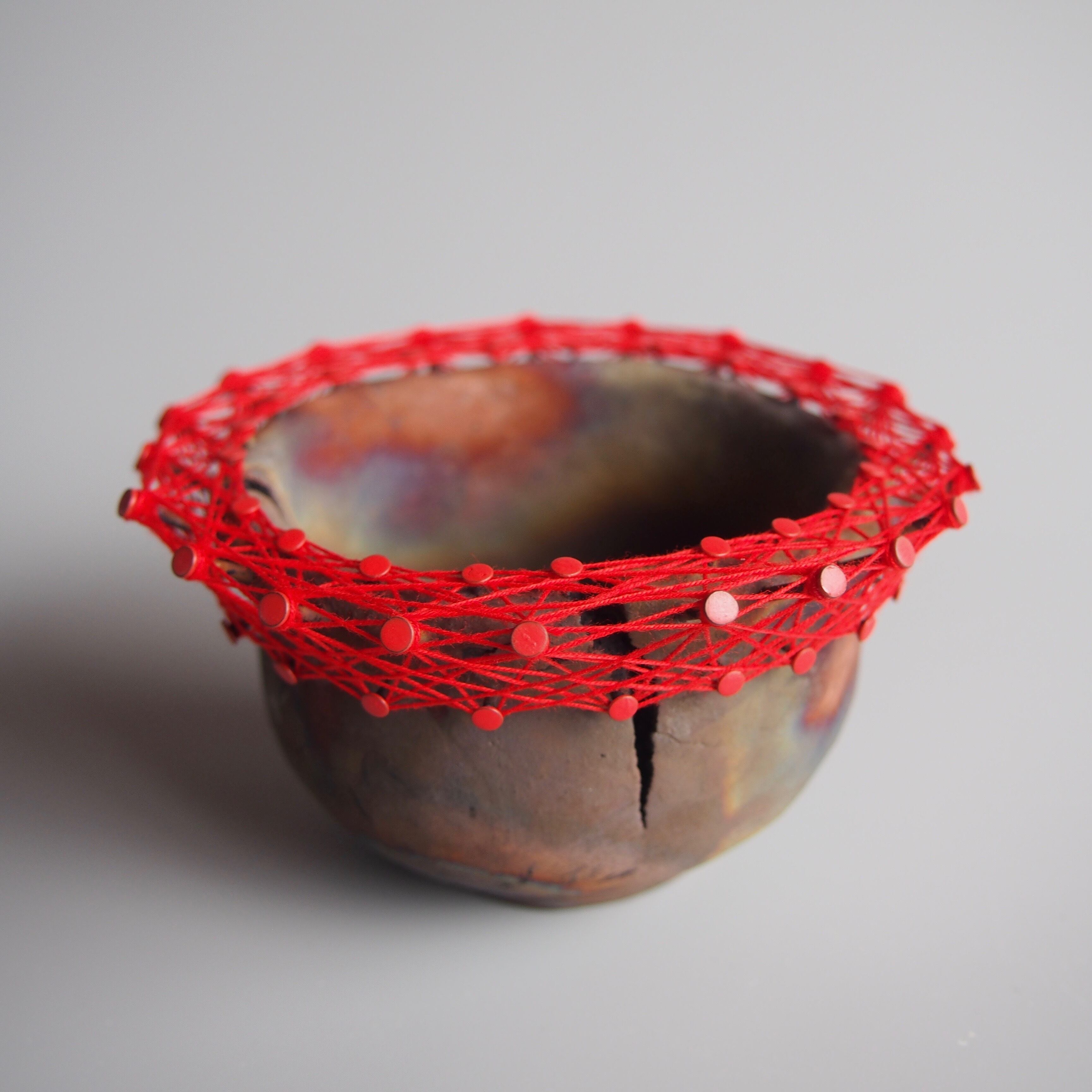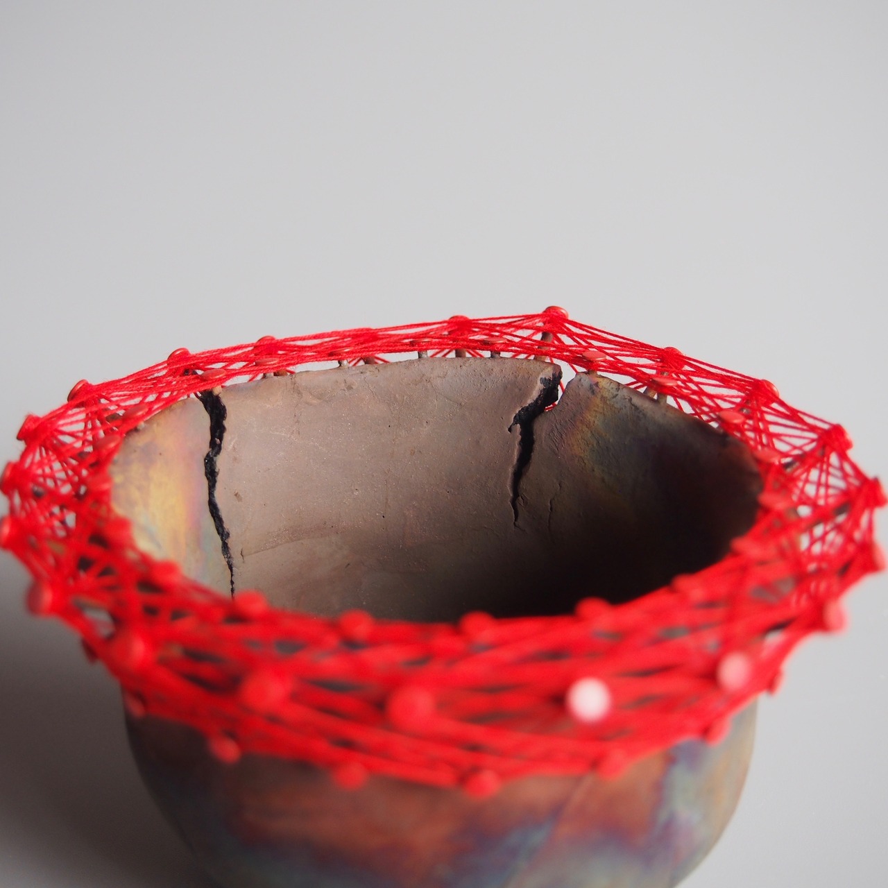 纏う、繕う、繋ぐ、縛る。器と糸の関係をどう捉えるかで作品の見え方は変わってくると思います。ご鑑賞いただく方それぞれの解釈で楽しんで頂けましたら幸いです。