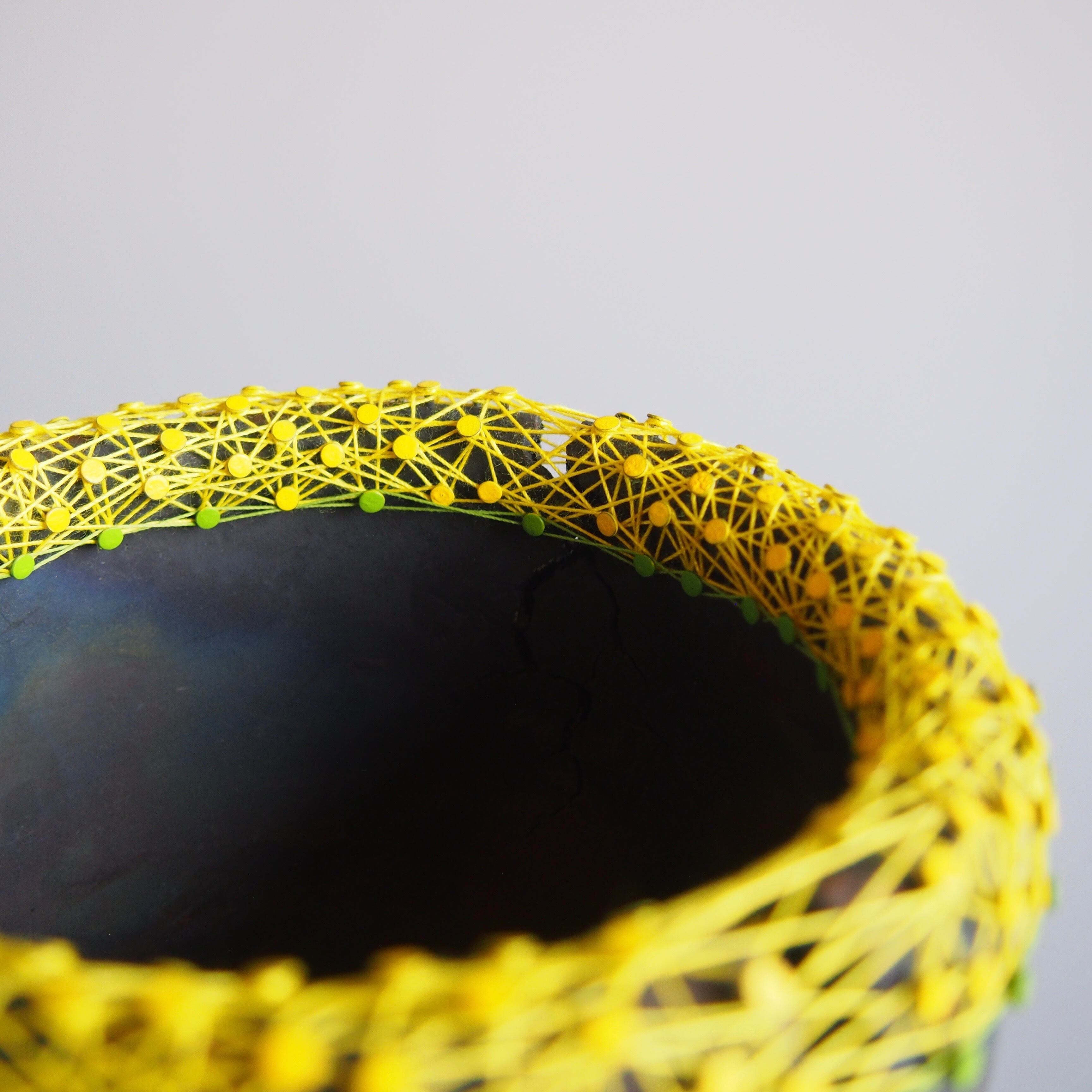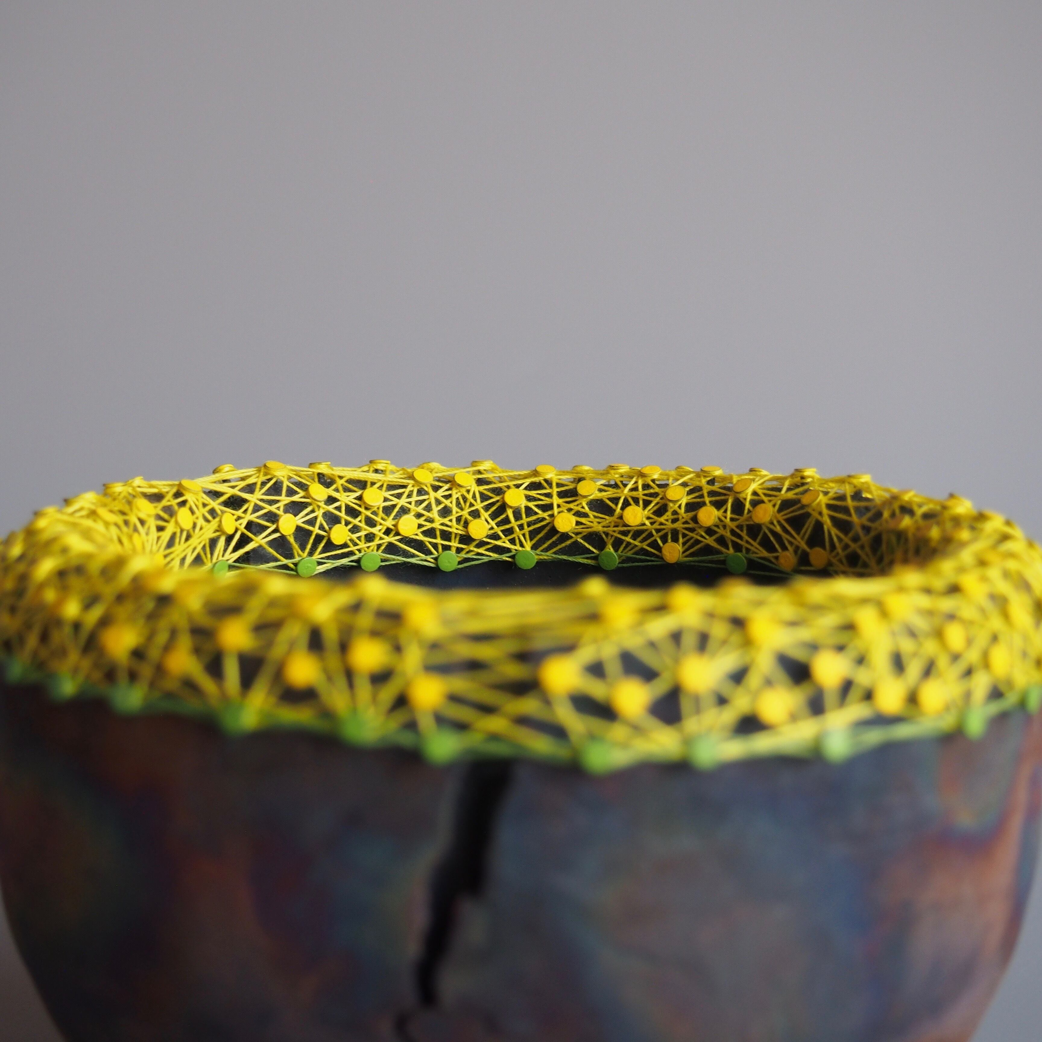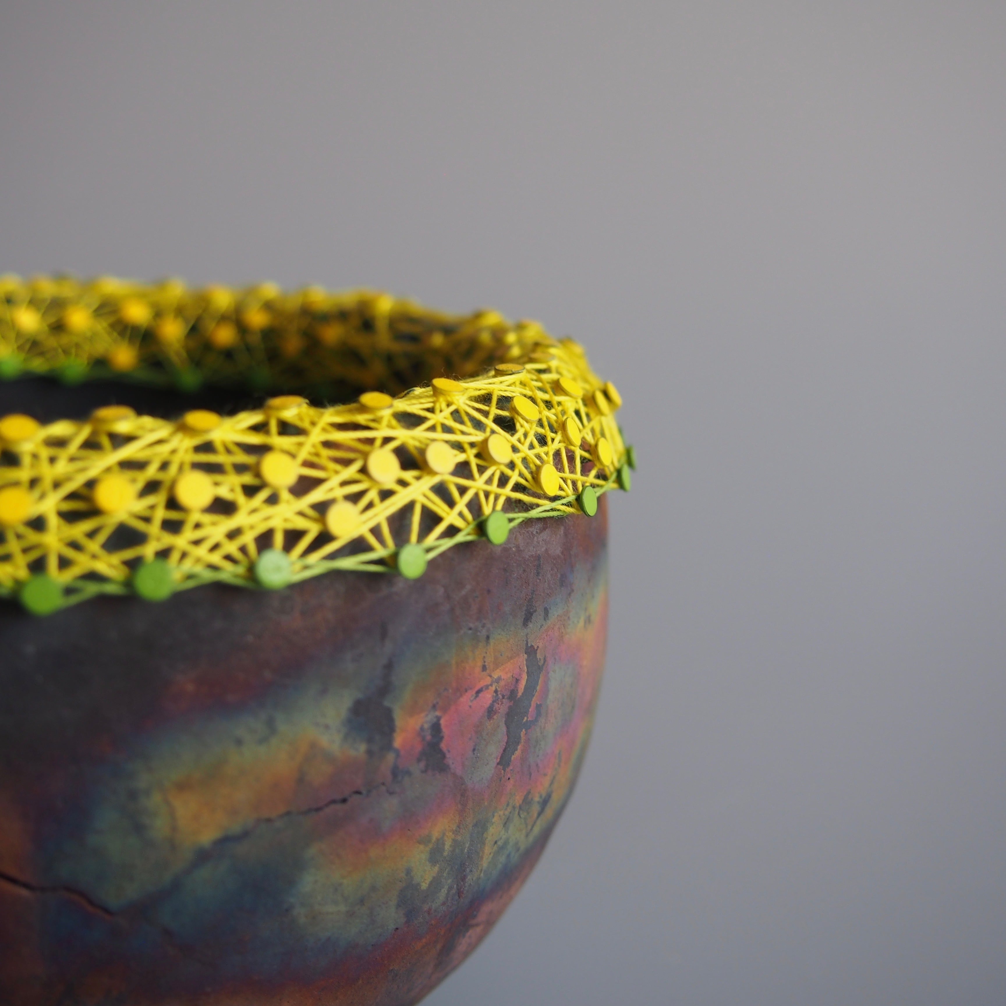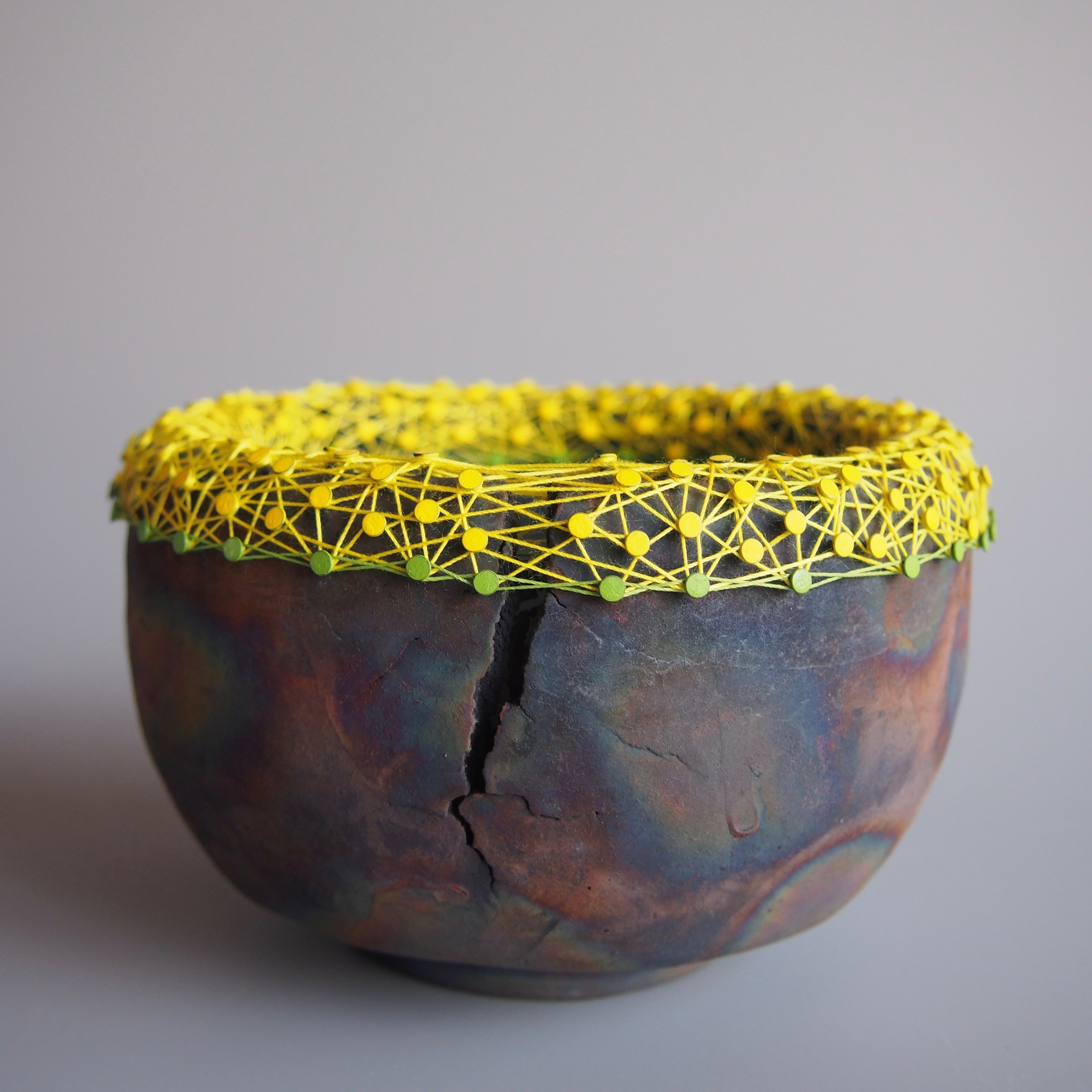 纏う、繕う、繋ぐ、縛る。器と糸の関係をどう捉えるかで作品の見え方は変わってくると思います。ご鑑賞いただく方それぞれの解釈で楽しんで頂けましたら幸いです。