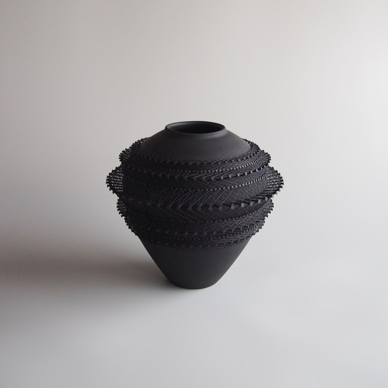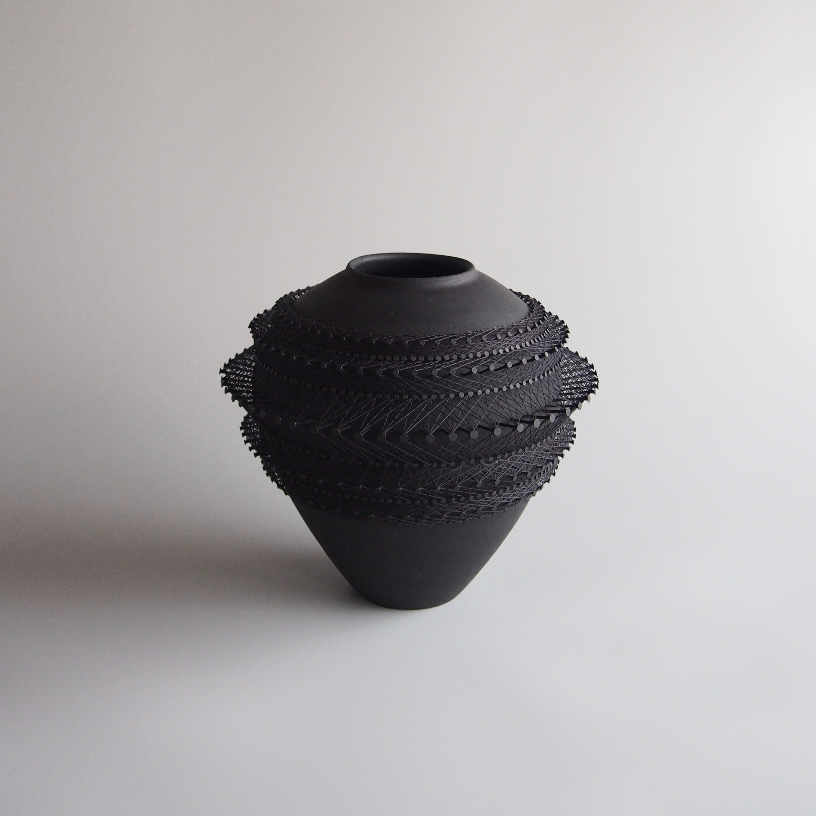 「装う」をテーマしたdressシリーズは、器(うつわ)と糸を身体と衣服の関係になぞらえ、土と異素材を組み合わせることで陶芸作品における新しい「装い」を表現しています。